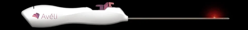 The Avéli device, a specialized handheld tool, is inserted just beneath the skin through a tiny incision.